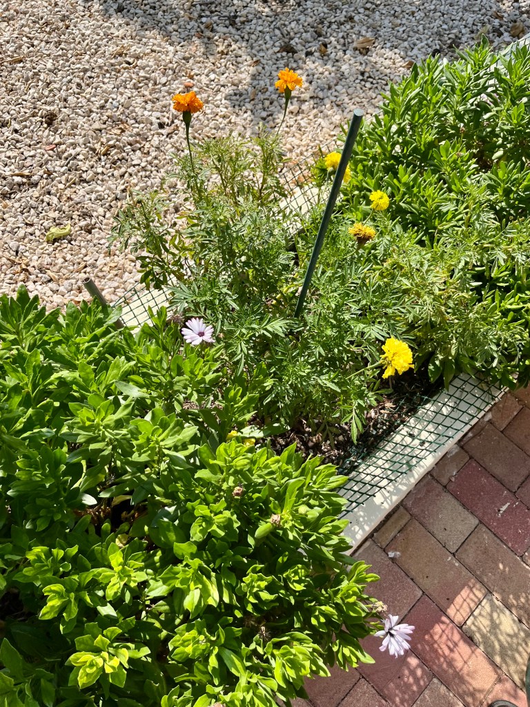 Marigolds. Marigolds are stalwarts in my flower beds and are wonderful flowerers all summer. You deadhead Marigolds in the traditional way by moving your secateurs down the stem. See photos.