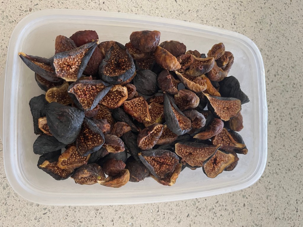 Leave your figs in full sun all day, but take them indoors each night and keep them covered. It takes about two to three days to dry the figs. The first photo below shows my sun drying technique, whilst the second shows some figs ready to freeze. They can be used as a snack or used in cereals and porridge.