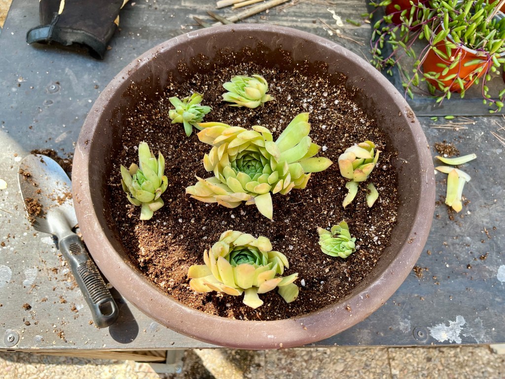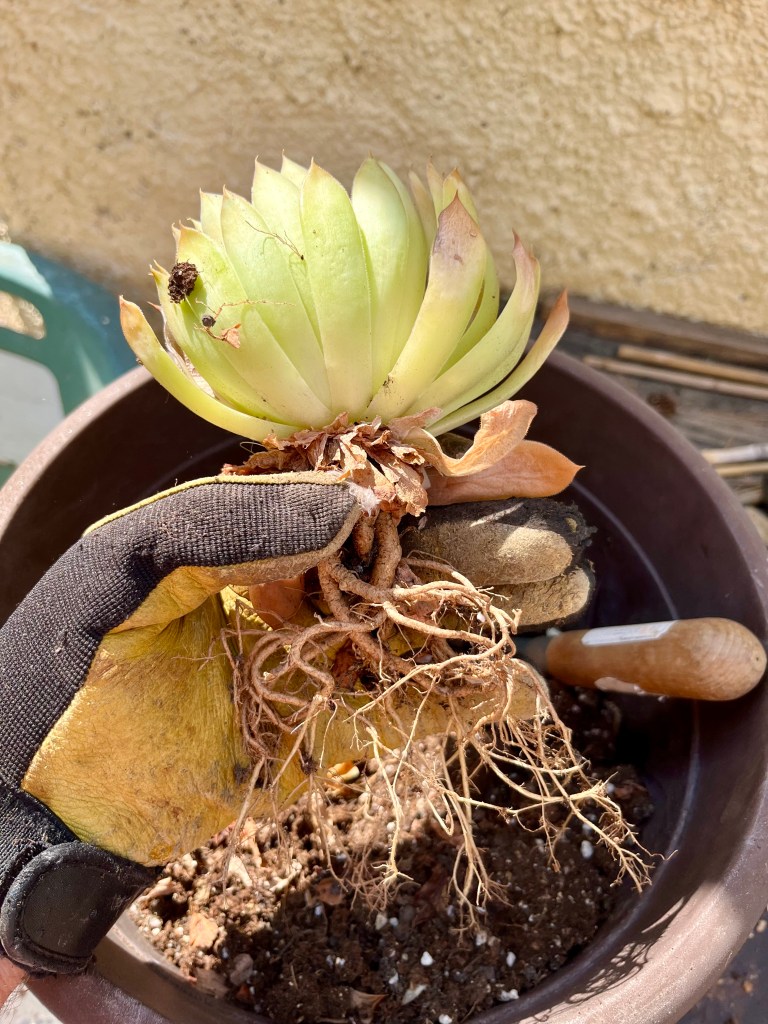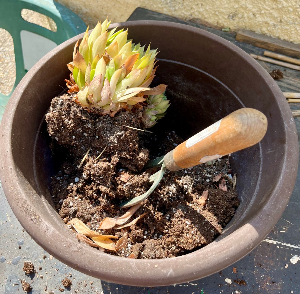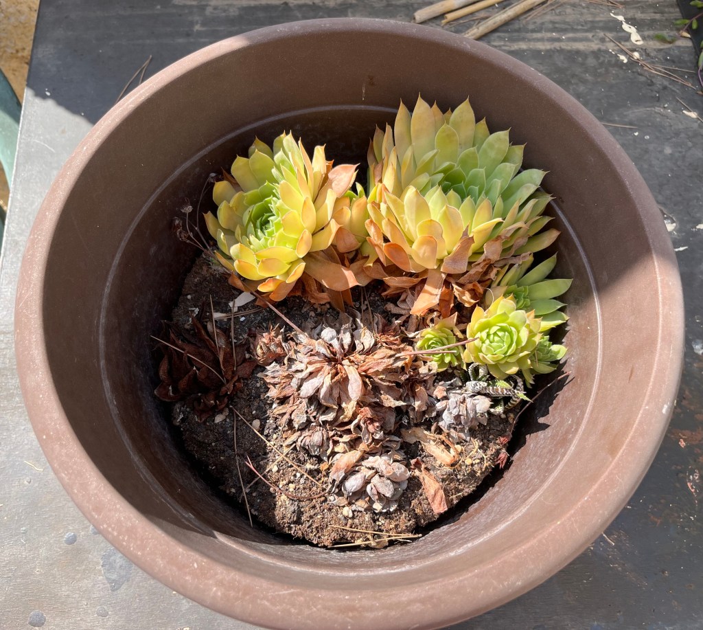 Rescuing a common house leek. I don’t have many succulents in pots, but a while ago I potted up some house leeks with a variety of other succulents and they looked rather nice. Well, they all started to die and rot and it was all my fault. It was simple really, my nice pot of succulents sat between two pots of petunias, and as I watered one pot of petunias and moved across to the next, I would just give the succulents a squirt of water. But never do this, or you will get what I got a pot of rot. See the photo below. Click on each photo for a larger view.