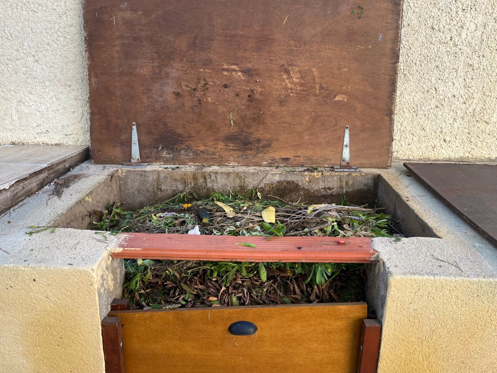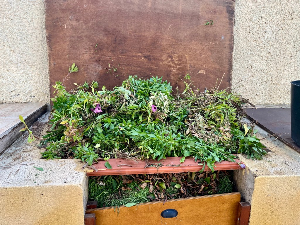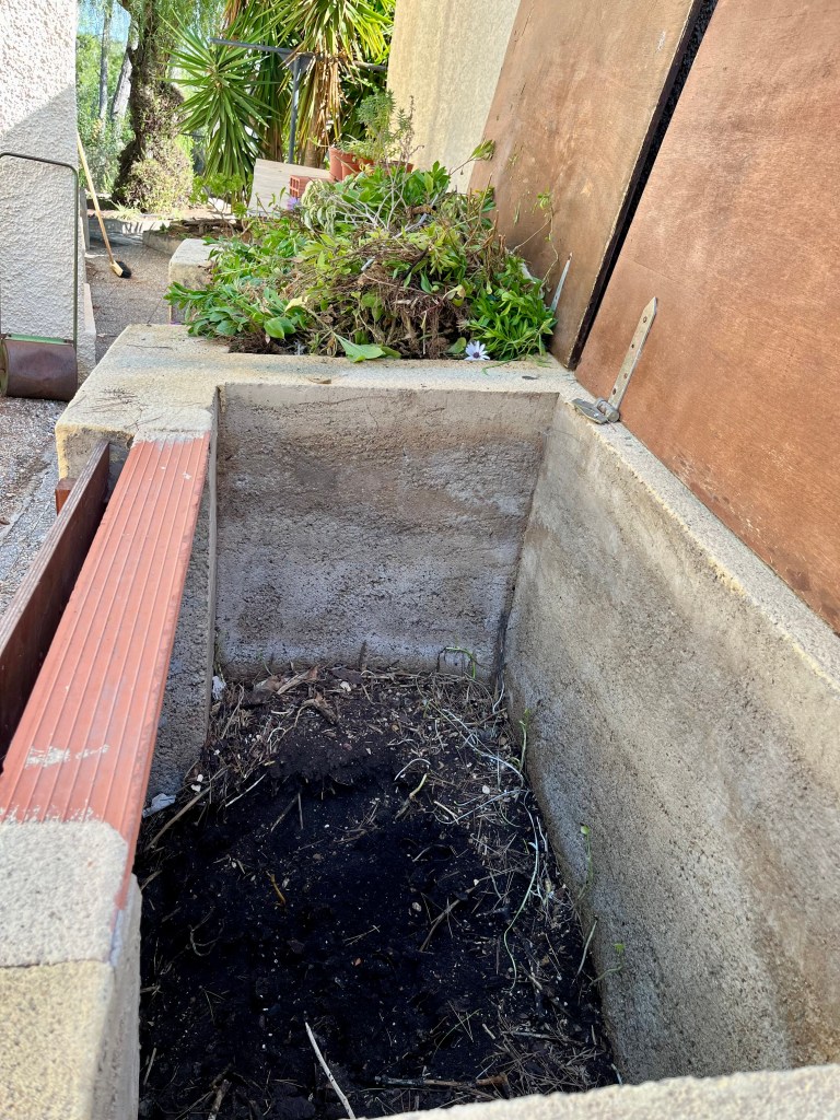 Gettting in the compost bin. One of the great joys at the end of a hard days gardening of trimming and cutting is to get in the compost bin and tread it all down. What do you mean you’ve never done this, just me then. One of the drawbacks of getting in the bin and stomping your compost down is that quite often you have cockroaches run up your legs which can be disquieting. To overcome this I have cut a board exactly the size of my bin which I fit into the top and then jump up and down on (patent applied for).