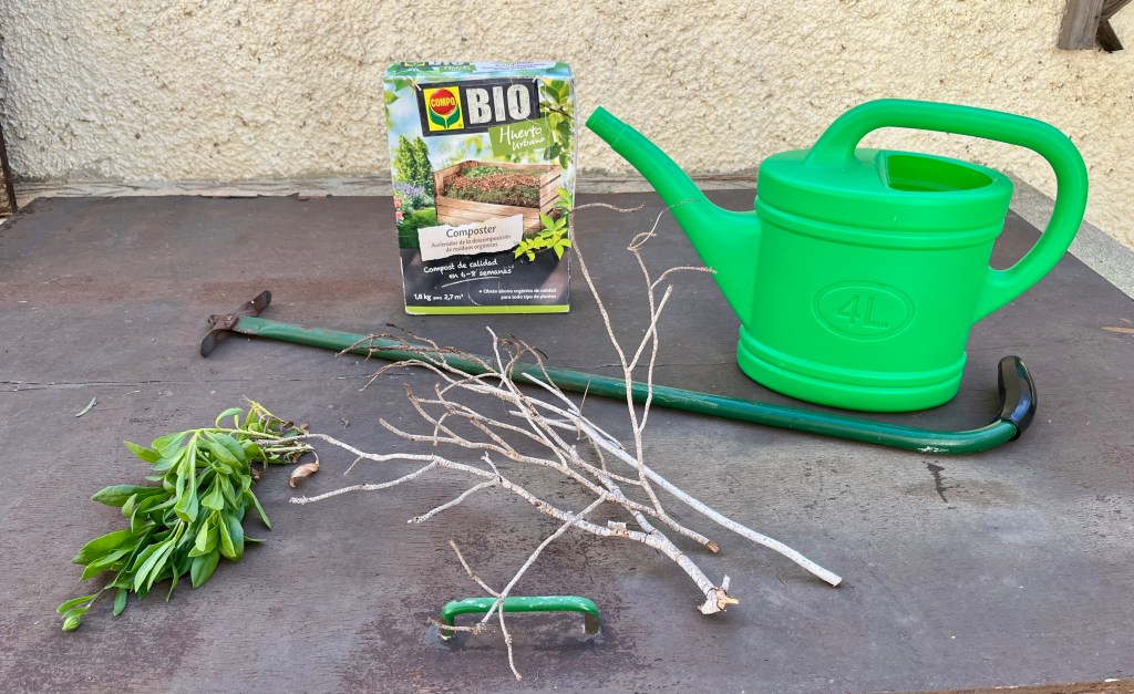 The photo below shows all the key ingredients apart from air; but I assure you it is there. In the photo you will also see a special compost turning tool that I bought some 20 years ago. You just push this into your compost heap then the two little wings at the bottom of the rod come out as you pull up and the whole heap is lifted and turned. If you can find one, buy it.