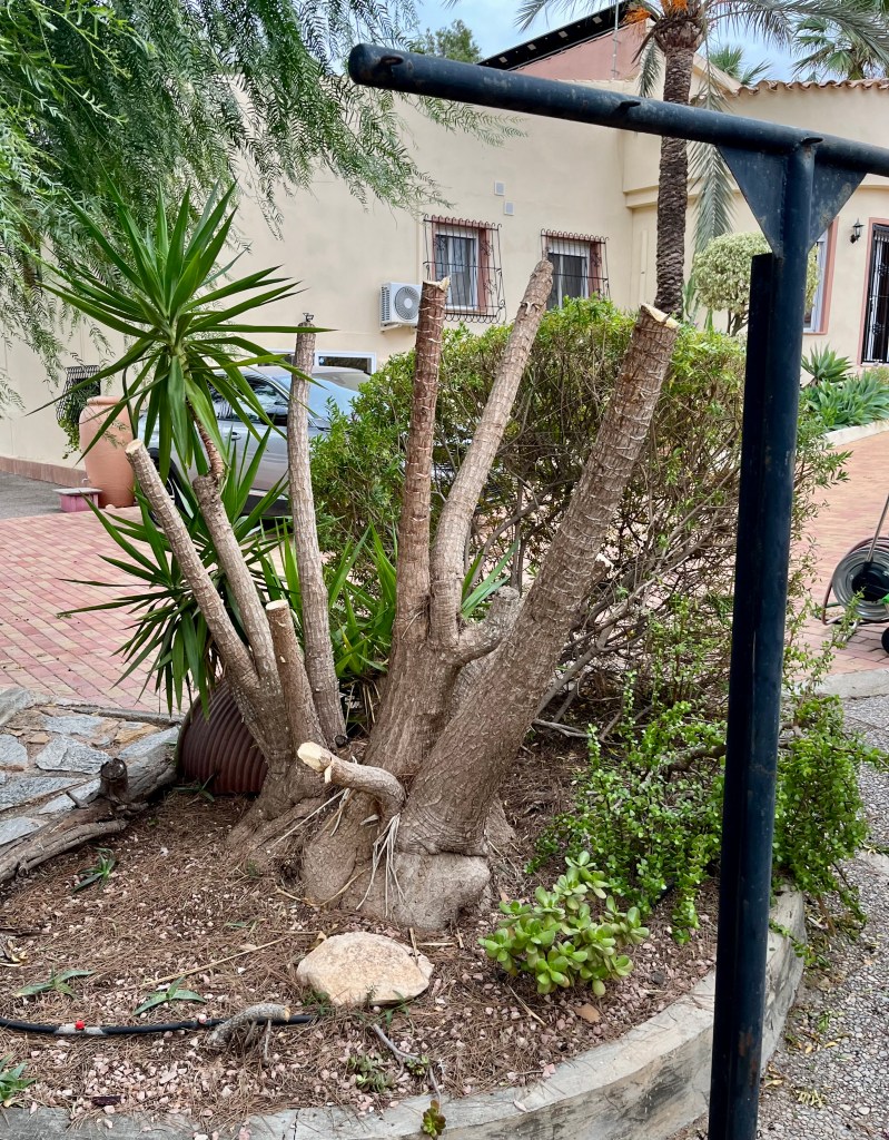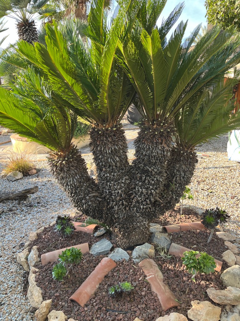 Trimming Sago Palms. Sago Palms are prized plants in many Spanish gardens. They provide structure, but are slow growing and because of this are very expensive. So if you have one you need to take care of it. I have a number of Sago Palms of various sizes, but the two that need attention are a large multi branch plant in my front garden and a smaller version in a pot. Photos below.