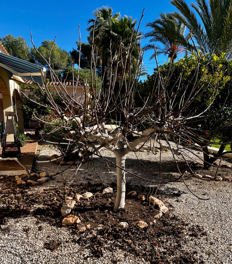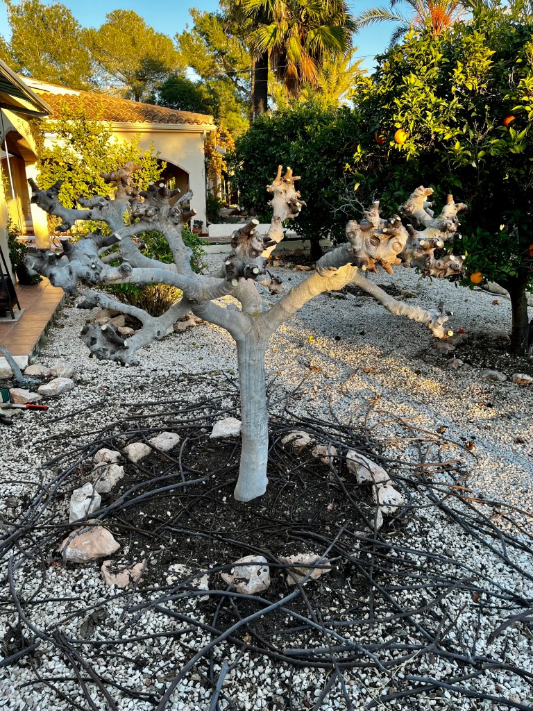 Pruning fig trees. Most fig trees in Spain are left to grow into huge towering hulks that lower over gardens in threatening sprawls. All too often their fruit is too high to pick and when it falls it makes a sticky mess all around the trunk mixed in with bird poo that creates a dead zone under the tree.