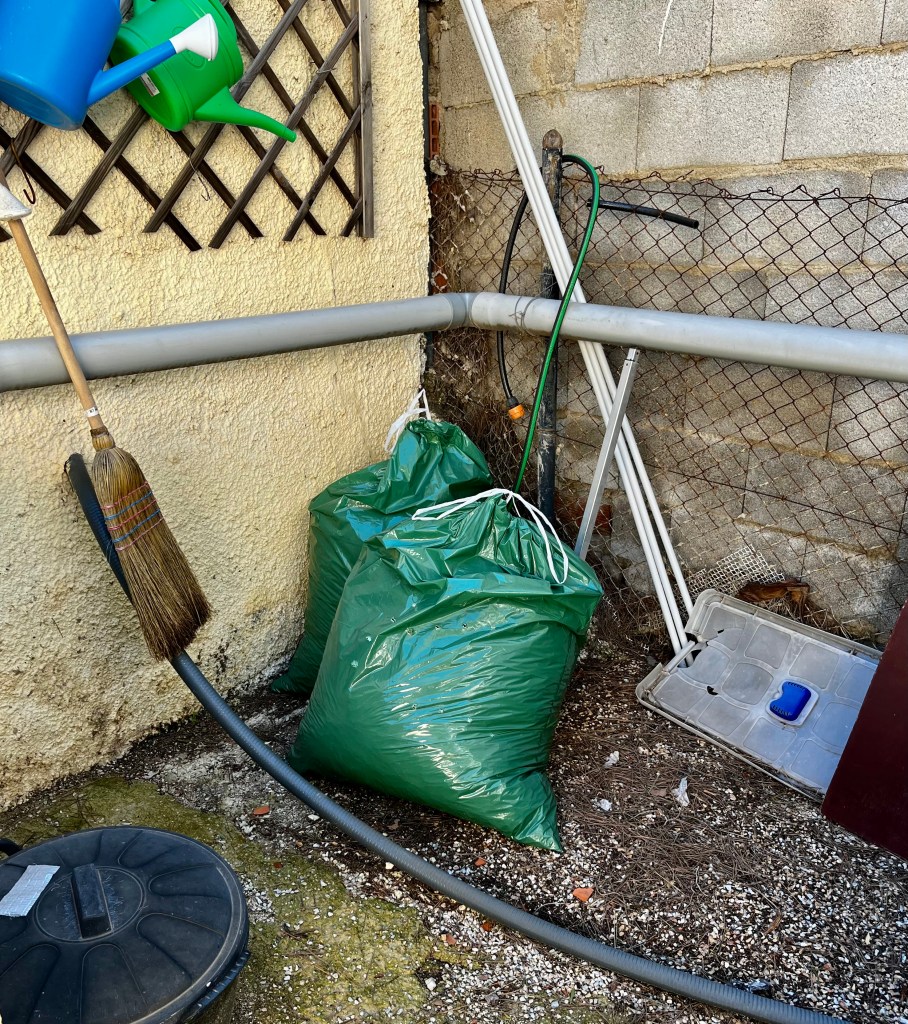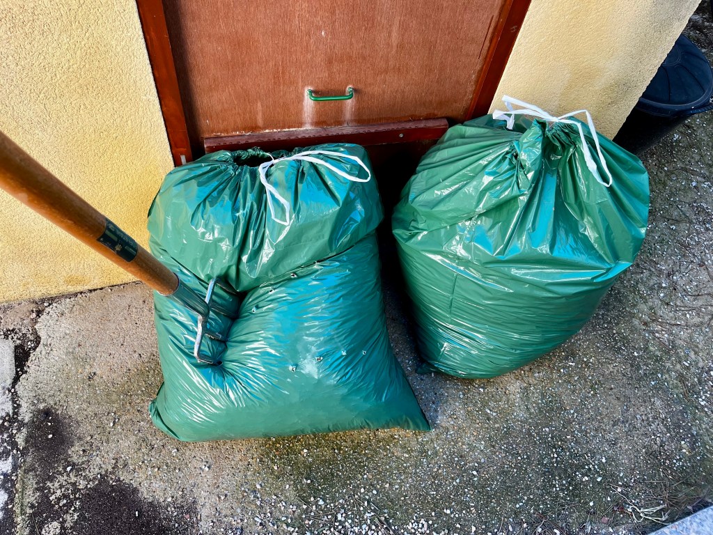 You have to clean them up, but don’t do it grudgingly, and don’t just throw them away. Instead compost your leaves to make a lovely top dressing mulch for next autumn. The first thing to do is to sweep or blow your leaves into heaps. Then load them into plastic sacks, making sure to crunch them down as you go. Once you have filled your sacks, puncture them with a garden fork in a few places to encourage air circulation. Once you are ready store them in a shady corner of your garden and just forget about them for 6 months. After this time they will make a nice mulch for top dressing. The photos below show my world famous sack pricking technique and my leaves shady corner.