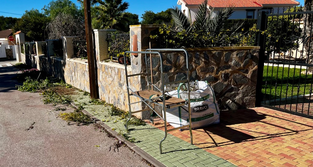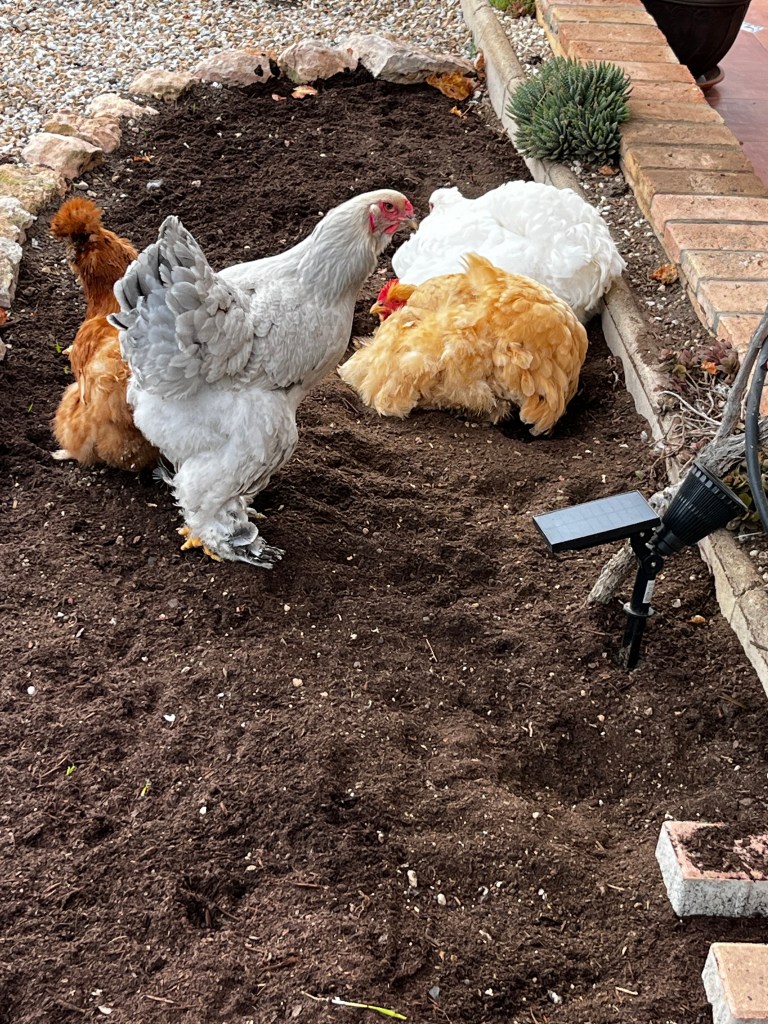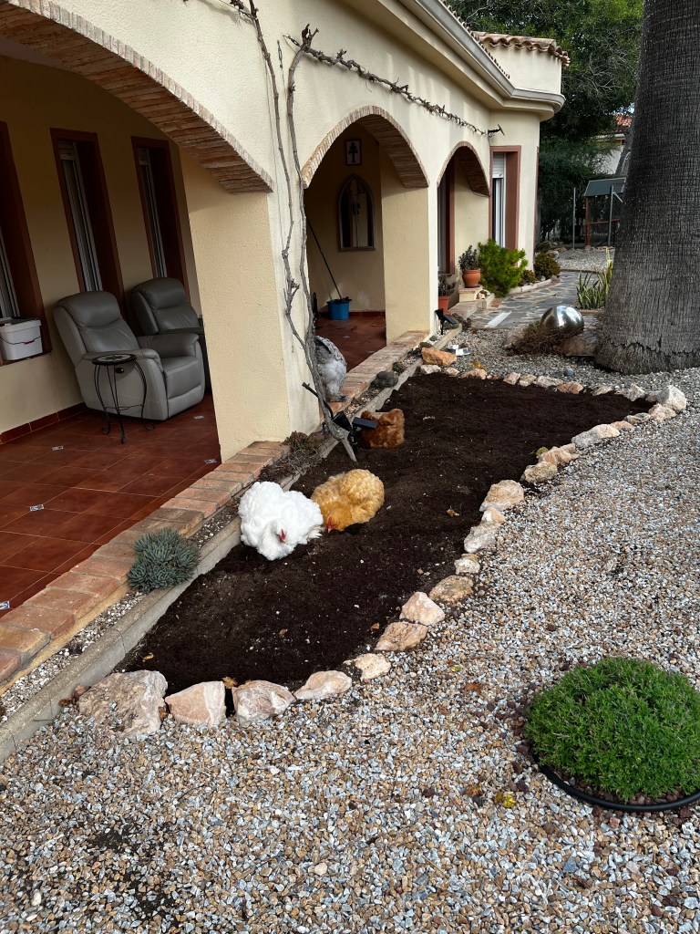 Refurbishing the chicken soft play area. I am ashamed to admit that I have a chicken soft play area in my garden. Basically it’s an area that once was lawn. It is located right in front of our Naya (Verandha) where Cruella and I sit and take our morning tea. I took out the grass and replaced it with cheap compost, this then allows Cruella’s girls to disport themselves first thing in the morning whilst Cruella feeds them sliced grapes and gives them their instructions for the day.