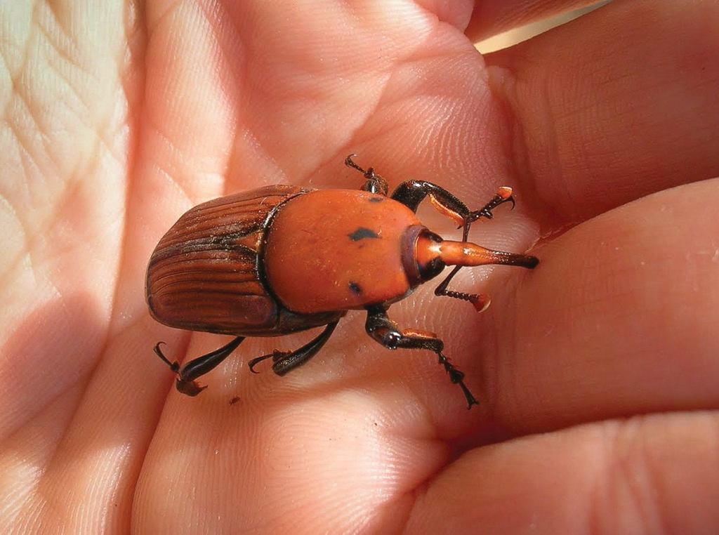 The thing is not only does this look unsightly it also dangerous as the added wind resistance can make the tree susceptible to wind rock and eventually falling. In addition all that dead vegetation hanging down is an ideal home for virus and of course the dreaded Palm Weevil shown in the photo below.