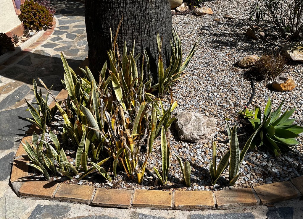 Another in the tidying up stakes is Mother in Laws Tongue (Dracaena trifasciata) which is usually ready for a tidy up this time of year. This plant is popular in Spain as it is unfussy and will happily spread through underground runners. The only problem with it is if left to its own it can begin to look a bit scruffy. The photo below shows my plant looking a bit of a scruff.