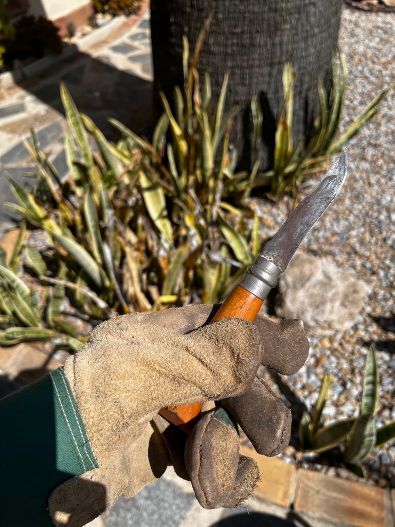 The first thing to do when clearing this plant is to trying pulling at all the dry brown stems and many will come away easily. For those that don’t you will need to get a good sharp gardening knife and go down to the base of each stem to where it’s attaches to the runner and cut these off at ground level. The photos below show my trusty old gardening knife (over 30 years old), followed by where to cut and finally the cleared plant.