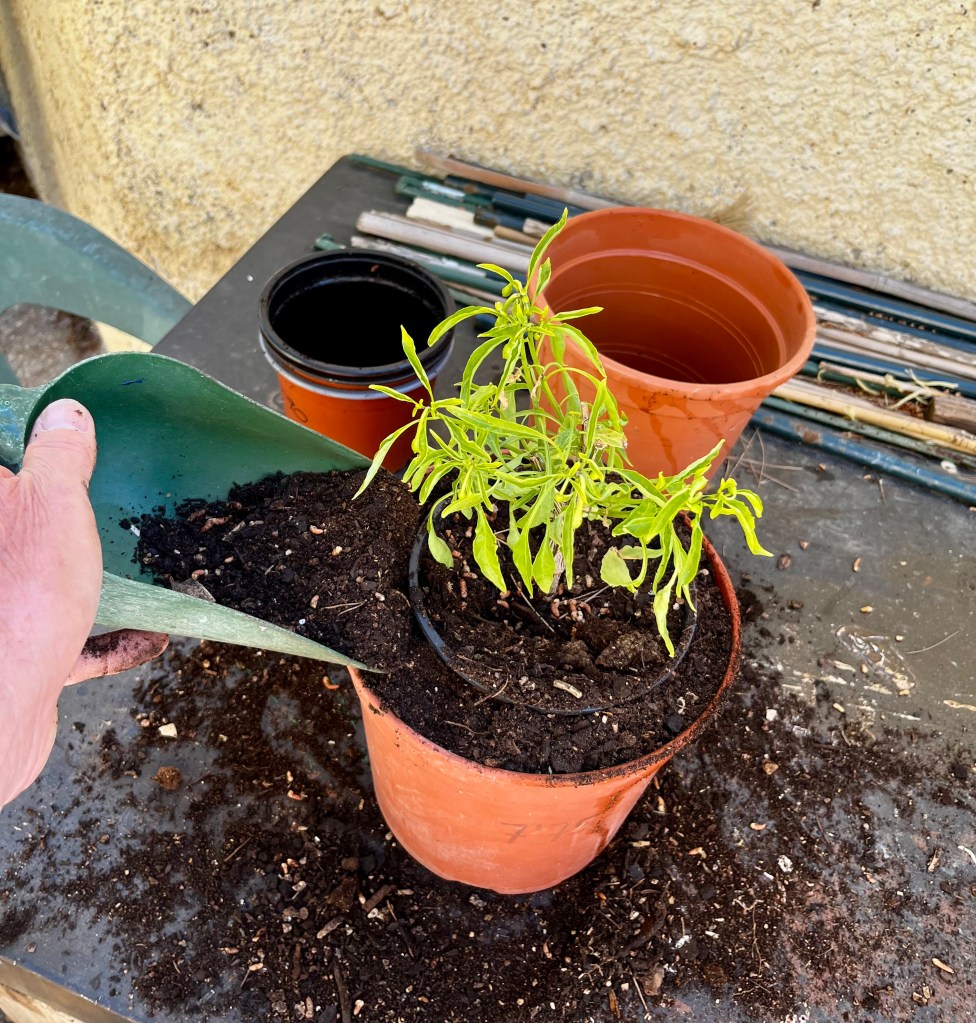 Like many plants Chillis do not like their roots to be disturbed too much so it is better to use the in-pot filling method shown in the photos below. This approach minimises any root disturbance and shock and ensure the plants will produce fruit more quickly.
