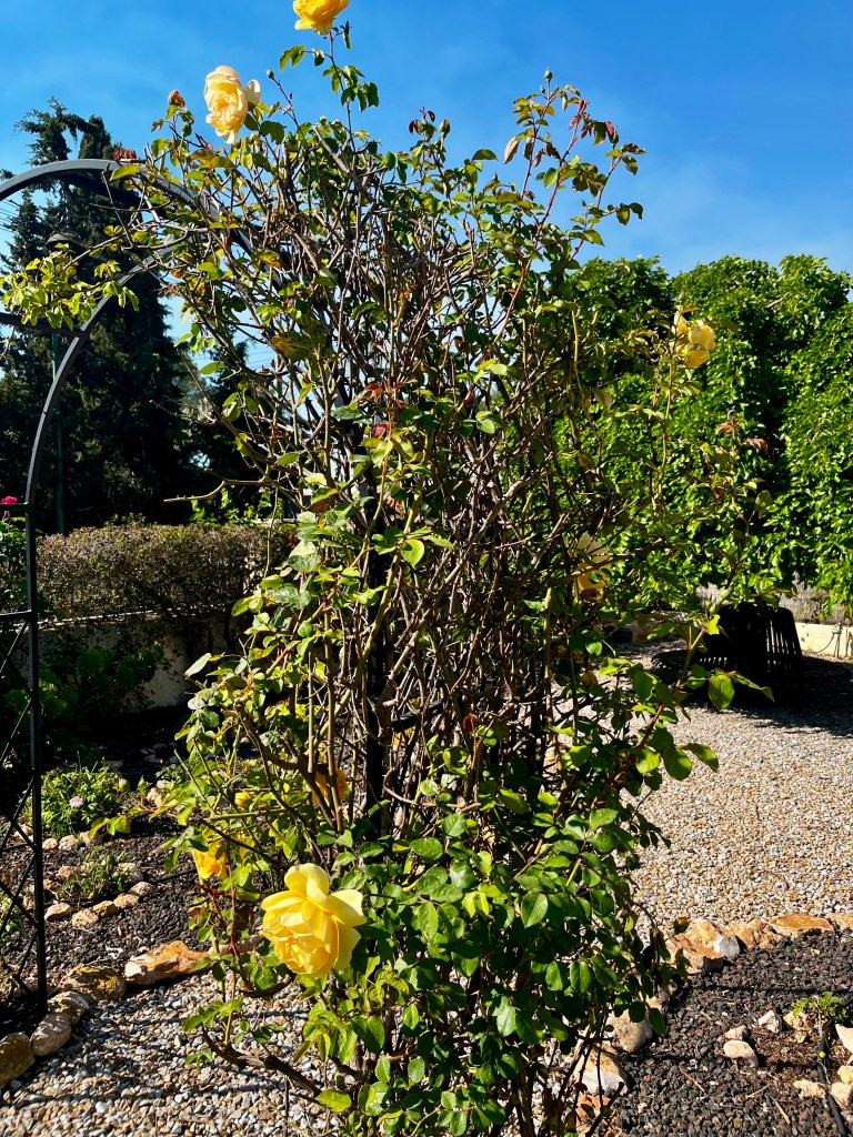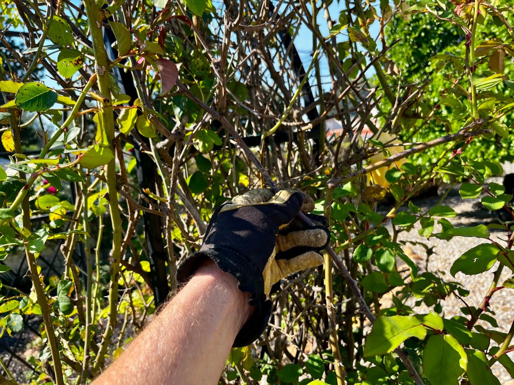 Finally climbing roses need as much dead wood cut out as possible. I find it is almost impossible to find deadwood on climbing roses over winter. I get fed up scraping branch after branch to discover if there is green beneath. Instead, I find it is better to wait until the plant begins to leaf up and blossom and then it is easy to identify the dead branches and these can be cut out. The photos below show the untangling and cutting out of dead branches. Make sure you wear gloves as blood will be spilled.