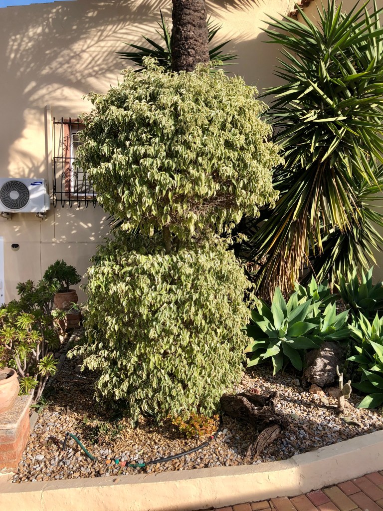 Pruning a variegated ficus. I have two variegated ficus one is quite small, whilst the other is larger and I have subjected it to cloud pruning. The secret with any variegated plant is to make sure that the moment you see a fully green leaf you instantly pluck it out. You can quite easily lose variegation as the green leaves can prove very dominant and will soon take over. Spain’s gardens are full of variegated ficus that have lost their variegation and are now common or garden old ficus – you have been warned, don’t come crying to me.