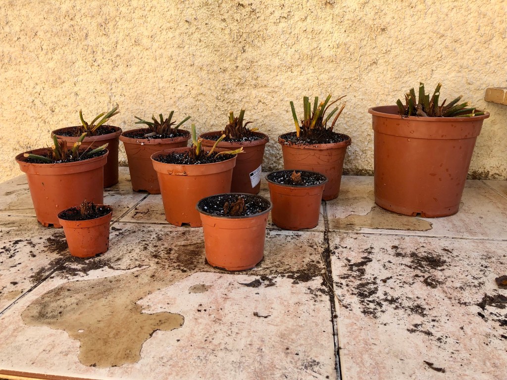 It is important when potting up too chose the right size pot for the pup. Don’t pick too big a pot as this will leave too much soil that can become a bit rancid and attract pathogens. Instead keep them nice and tight. Firstly put a layer of compost at the bottom of the pot. Then gently place your pup on top pushing it down firmly to ensure good contact with the compost mix. Next fill around the sides of the pup firming down as you go. Don’t bury the pup just take the soil up to about three quarters of the pup and leave the rest sticking out. Finally water well and leave to stand in the shade. From on then let the pup dry out a bit between watering. Do not be tempted to take the pups out into the sun until they are well established. In a month or two you should see growth. The first photo below shows the planting process whilst the second shows the pups proudly in their right size pots. Click on each photo for a larger view.