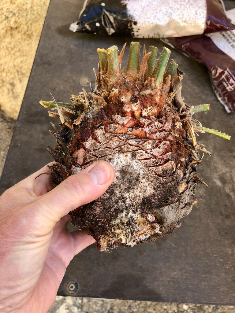 Potting up my Sago Palm pups. If you are following this blog closely, and I know you are, then you will remember that in my last post I removed pups from below my Sago Palm and left them for the cut scar to dry off. Well round about a week should do it, so if you cut some off now is the time to plant them up. The first thing you need to check is that the scar where you cut the pup off is completely dry. If it is then you are good to go. The photos below show the nicely dry scar and the pups excitedly waiting on the potting bench. Click on each photo for a larger view.