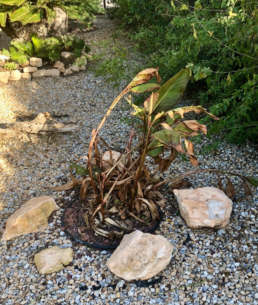 Redesigning my little water feature. A number of years ago I designed and built a little water feature that would burble away whilst I swung backwards and forwards in my adjacent hammock slung between two palm trees. It also served to alleviate the sameness of gravel, by introducing planting and different colour gravel. Unfortunately, this was BC3 (before chickens). Since then my hammock has been removed a fenced area installed and a chicken coop erected in my previous paradise. This has meant that my little water feature has been neglected, and anyway the previous lavender plants never worked out. The photo below shows the state of neglect.