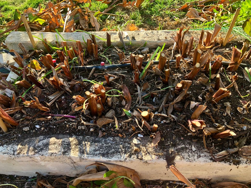 To be honest it has not been a good year for Cannas they suffered from the lack of rain, so by cutting back now we can hopefully have a better flowering next year. The secret to cutting back Cannas is not to cut them right to the ground. If you do, then you are in danger of letting water and eventually rot get down into the rhizome. Instead cut the stem about 3 to 5 inches from the ground and just leave them. The cut stems will mainly dry off and can be plucked out next year, whilst new stems will grow from other “eyes” in the rhizome. The photos below show some of my cannas cutback. Click on each photo for a larger view.