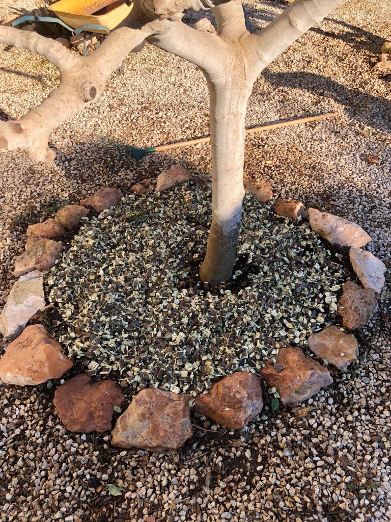 A useful adjunct to your pruning is to leave the cut stems on the ground for a few days to let them fully dry out, and then shred them and lay them as a mulch under your trees. The photos below show the final mulch laid around the tree.