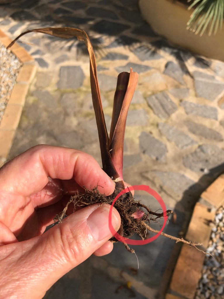 The first photo below shows the level you would normally cutback each year. However, I have to cutback further because of the congestion at the centre of the plant, and the second photo shows the drastically pruned plant. Click on each photo for a larger view.