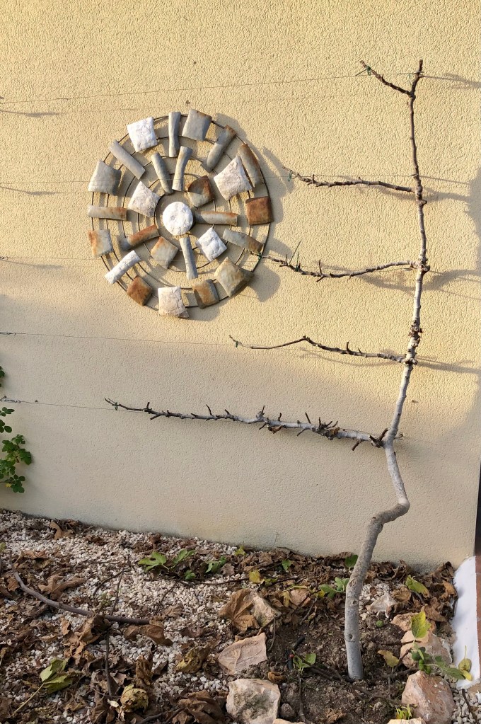 Pruning grapevines. In a similar way to the fig, grapevines should now have lost most of their leaves and the sap should no longer be rising. I have three grapevines which are basically ornamental, but look lovely in summer. The main grapevine grows along the front of our Naya and it’s stems hang down to form a lovely fringe along the front of the house. The other two grow along balustrade at the side of our pool and provide a barrier to table tennis balls going out of the pool area (don’t ask). The vines can be seen in their uncut state in the photos below. Click on each photo for a larger view.