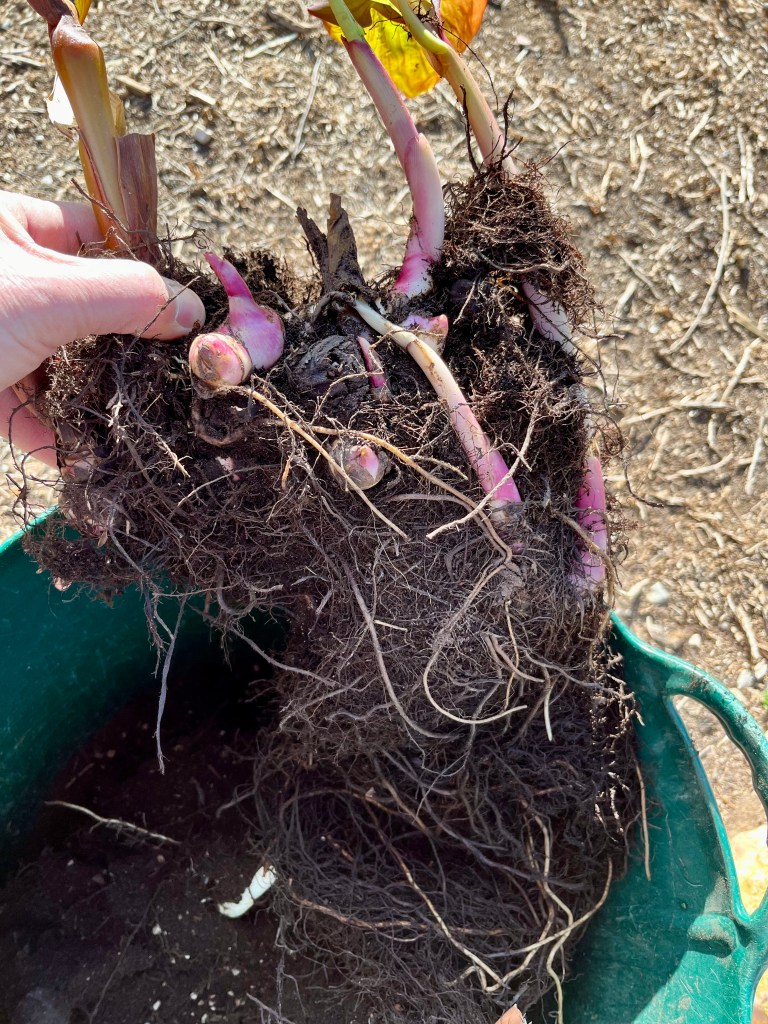 Finally, when planting cannas you need to bury the rhizomes just below the surface of the soil with the old stem sticking out of the soil. The new flowers will come from nodes on the rhizomes and not from the stem. The stem is only there to stop water seeping into and rotting the rhizomes. The photo below shows some that I am just replanting (note the depth).