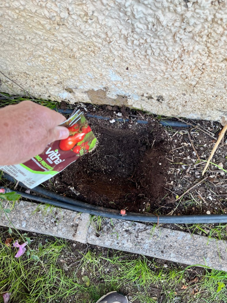I mix up a special mixture of 1/3 rd of my old compost, 1/3rd good professional compost and 1/3rd horse manure compost. I add a bit of Rose food to this mix and always sprinkle the roots with Myocorrhizal Fungus to help quick rooting. The photos below show this process in action.