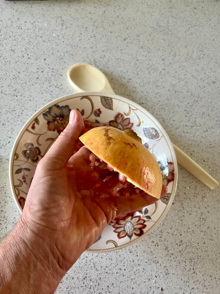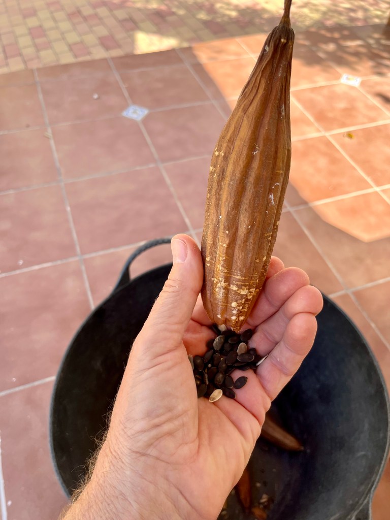 I would add a note of caution should you wish to copy me. At first you will be able to lean your ladder up against the old palm trunk as you trim. However, after a number of years the centre of the trunk will rot and it is not safe so you need to use a stepladder. Apart from that it is lovely as can be seen below with its seed pods giving winter interest before it is cut back.