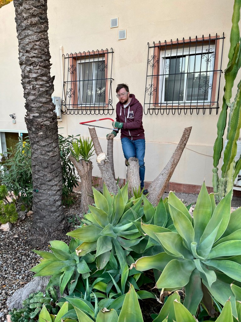 From these photos you can see that there are two key areas of pruning. Firstly the undergrowth of pups needs to be reduced so that you can successfully walk past the palms without being snagged. Secondly the crowns on the large palms need to be pruned back so that the top fronds stand up. When cutting back palms it is always wise to wear a thick jacket and make sure you wear goggles. Despite my best efforts I ended up with a Palm frond hanging by a thorn from my nostril – very painful.