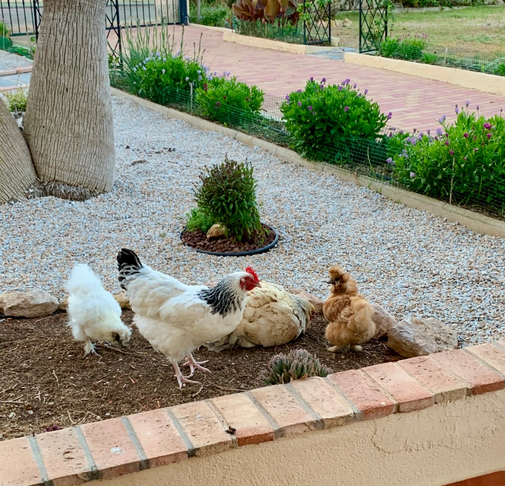 She knows when it is time to begin knitting as the chickens gather in a huddle on our Naya to get out of the cold winds. Helga (her favourite and a really clever chicken) even flys up to the window ledges and taps on the glass to be let in. Cruella (my wife) even begins to gather them up and carry them to bed every night and sometimes stays out there for hours with them; I think they have wine!
